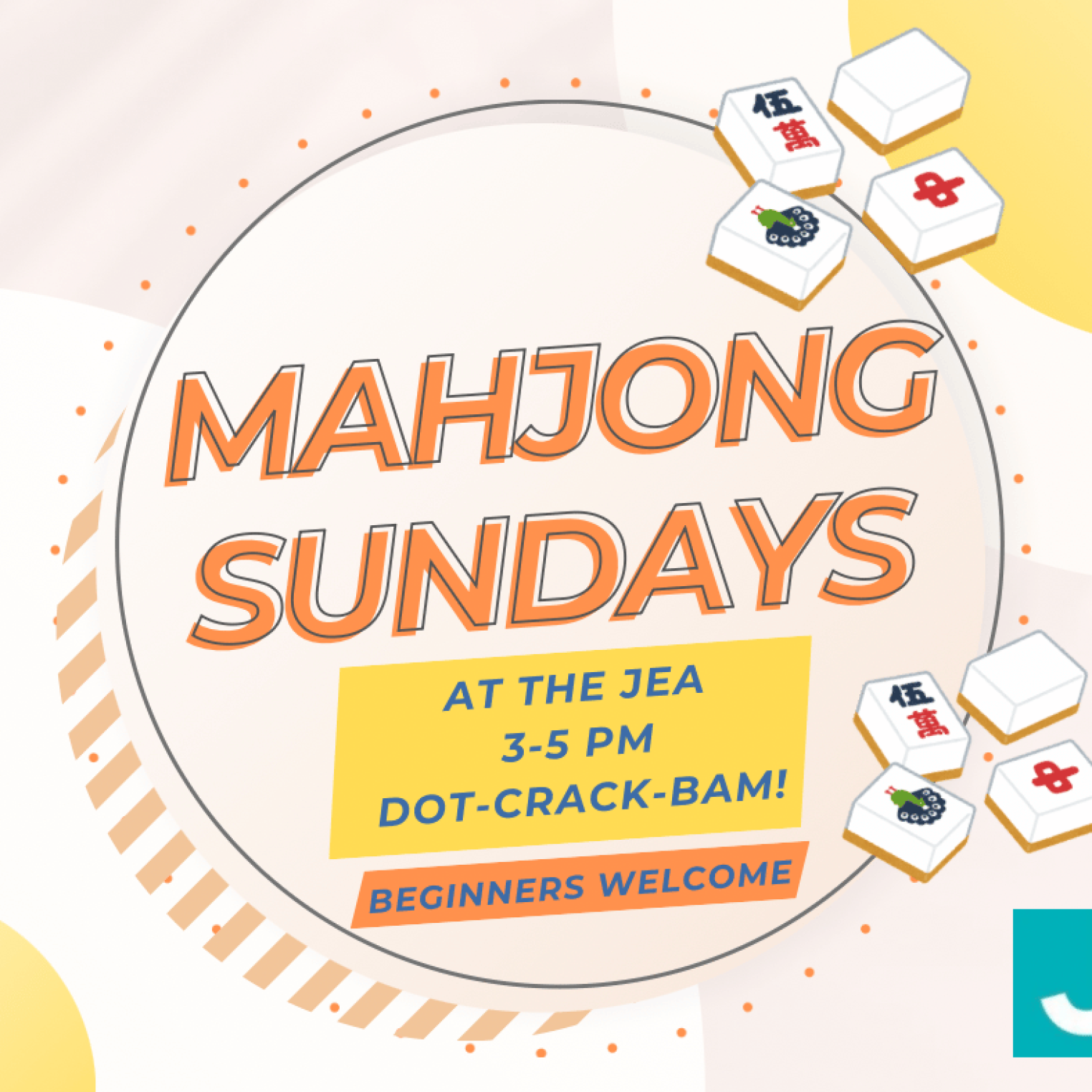 Come and enjoy a relaxing and fun-filled afternoon of Mahjong at the JEA. Whether you're a seasoned player or just starting out, everyone is welcome!