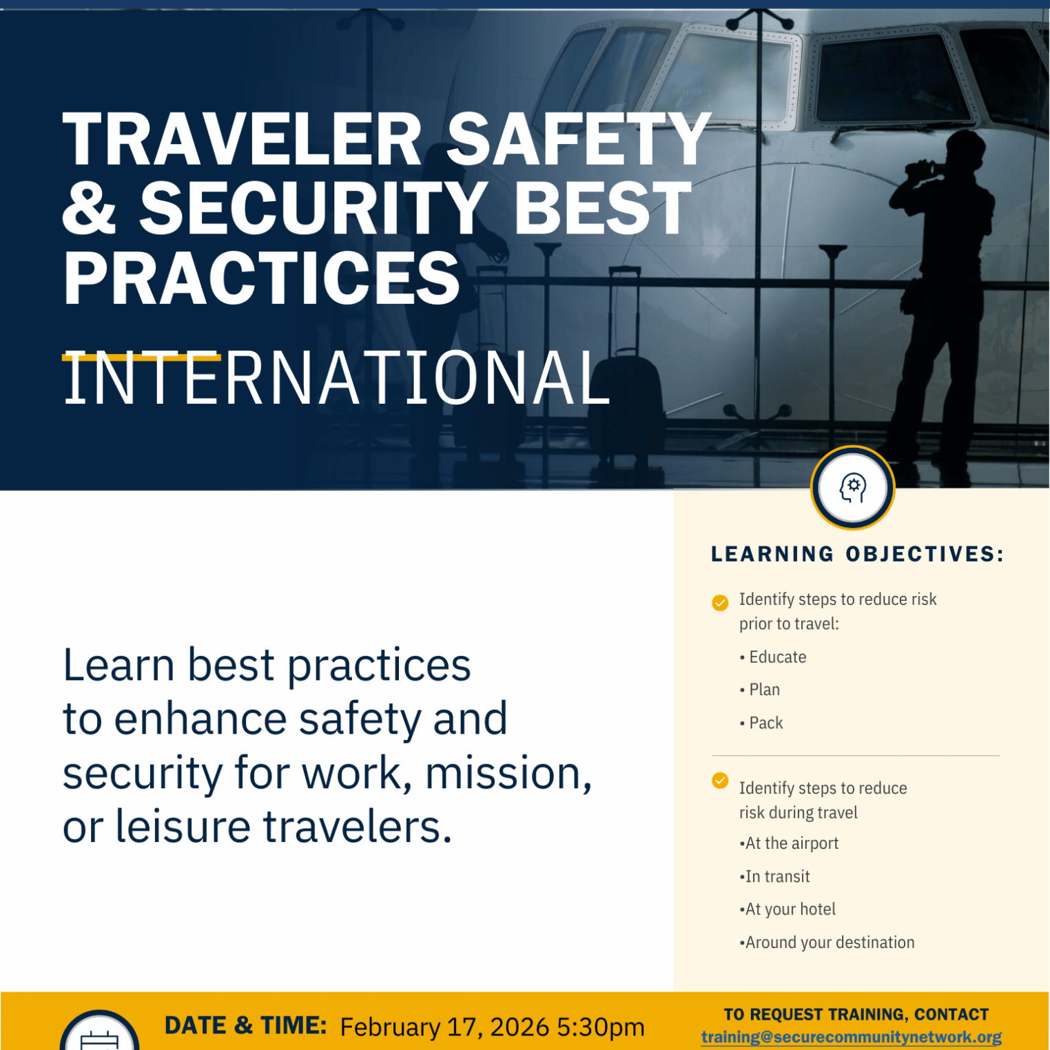 Join our Community Security Director, Richard Ray for a focused training on staying safe and aware while traveling, presented in partnership with the Secure Community Network (SCN).